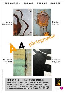 Je participe à une exposition collective A4 Photographie ou j’expose une sélection du thème Empreintes avec des oeuvres de Roxane Maurer – Jacque Pinier – Daniel Perrin du 19 mars au 17 avril 2016 à: Vernissage le samedi 19 mars 2016 à partir de 17h30 – Ouverture les vendredi de 17hà19h – Samedi & dimanche de 15h à 19h |