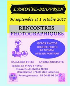 J’expose aux 15èmes Rencontres Photographiques Lamottoises une sélection du thème Au-delà du Corps le 30 septembre et 1er octobre 2017. Cette exposition se déroulera à la Salle des Fête de Lamotte Beuvron – Samedi30 septembre de 14h à19h – Dimanche 1er octobre de 9h à 19h. http://photoclublamottois.net/ |
